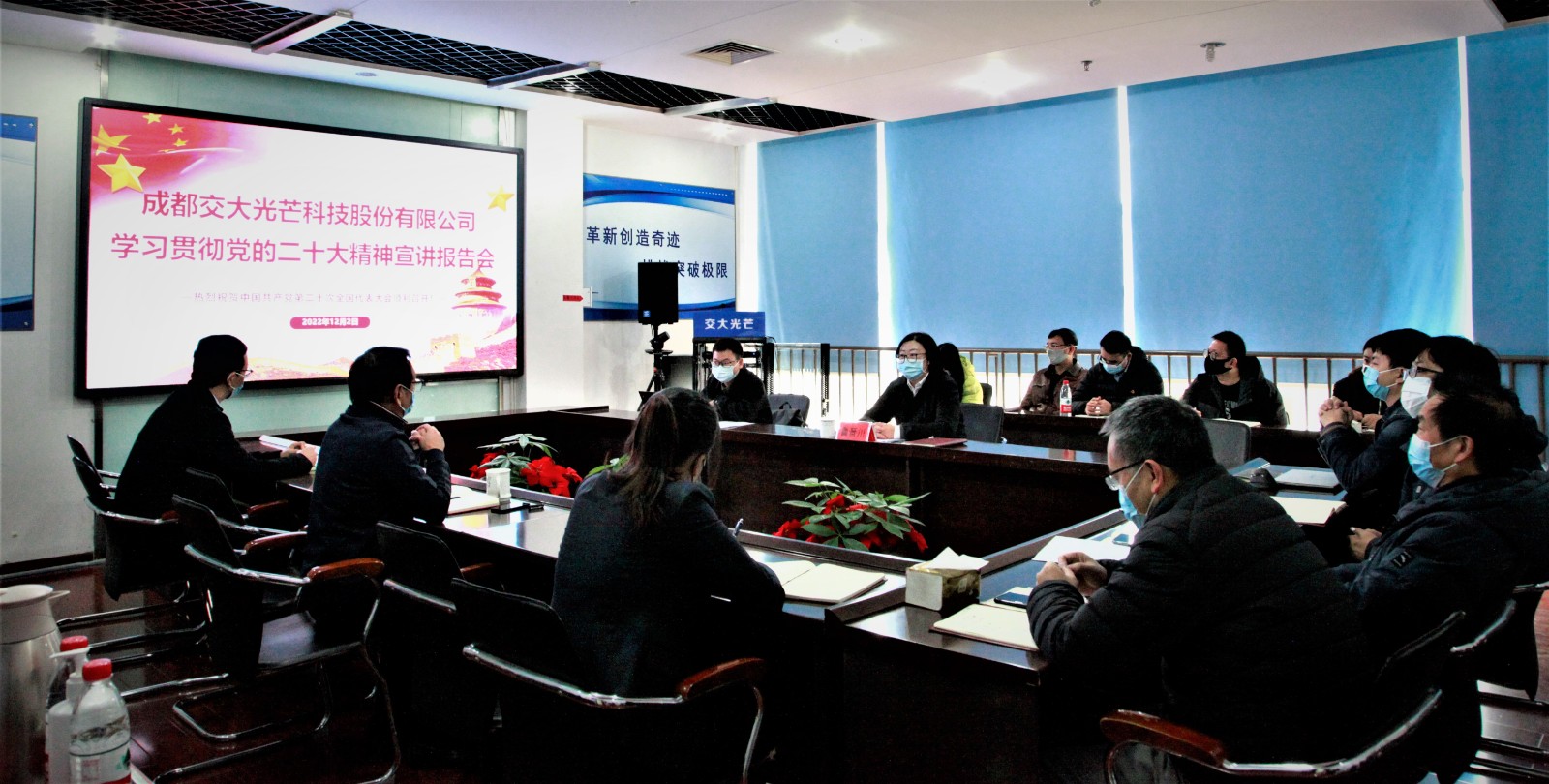 2022年12月2日上午,川投能源董事會秘書魯晉川赴交大光芒開展學習貫徹黨的二十大精神宣講報告會,深入宣講黨的二十大精神、進一步部署推進學習貫徹工作。公司領導班子、全體黨員參加了本次宣講報告會。黨總支書記、總經理劉成輝主持會議。