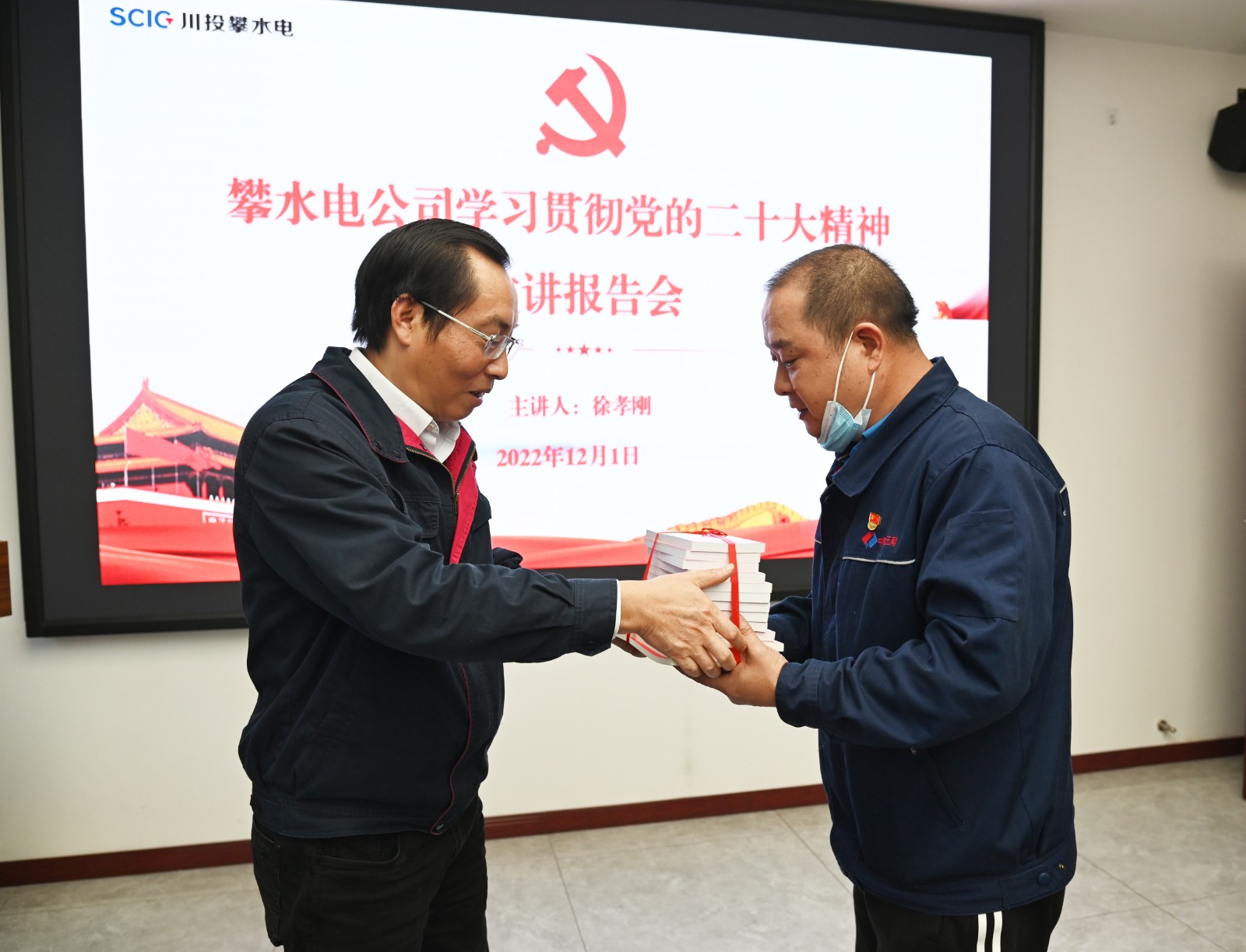 徐孝剛要求,要把廣泛開展面向職工群眾、一線工人宣講黨的二十大精神作為加強思想政治引領、廣泛凝聚民心的重要抓手,結合工程建設實際,切實確保黨的二十大精神宣講更有特色更有活力。要把學習貫徹黨的二十大精神與銀江水電站工程建設實際相結合,與工程建設重點任務、重要困難、重要目標節點等結合起來,高標準、嚴要求推進工程建設。宣講會后徐孝剛向水電五局項目部贈送了《黨的二十大文件匯編》口袋書、《黨的二十大報告學習輔導百問》《二十大黨章修正案問答》等書籍。